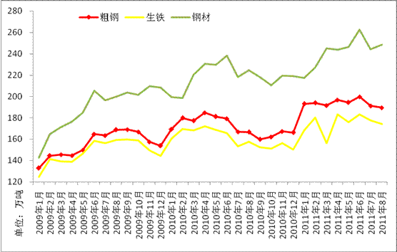 1-8月國內粗鋼產量為46928.3萬噸,同比增長10.6%。